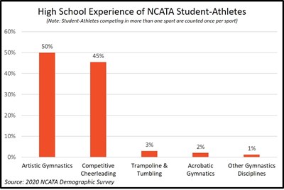 A: Student-athletes typically have competitive experience in various disciplines of gymnastics – primarily artistic, acrobatic, trampoline, or power tumbling – or are experienced participants in competitive cheerleading. However, student-athletes who have previously competed in Acrobatics & Tumbling have also come from other traditional sport backgrounds like track & field, and swimming & diving, or have performance backgrounds in dance. Potential student-athletes are identified through participation on their high school, junior college, or club teams.